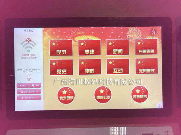 廣州浩田有限公司為機(jī)關(guān)單位訂購(gòu)的紅色朗讀亭,并通過(guò)紅色學(xué)習(xí)朗讀亭以“紅愛(ài)國(guó)”“黨建”“掃黑除惡”“黨風(fēng)廉政”為主題,將朗讀與紅色教育碰撞火花。紅色學(xué)習(xí)亭整體機(jī)身采用紅色,與黨和國(guó)家的主題相符合。內(nèi)容圍繞黨史/黨風(fēng)廉政/新聞/學(xué)習(xí)等多方面進(jìn)行。