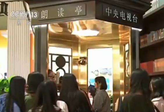 在展廳,中央電視臺(tái)《朗讀者》欄目的線下體驗(yàn)專區(qū)“朗讀亭”外每天都會(huì)排起長(zhǎng)隊(duì)。