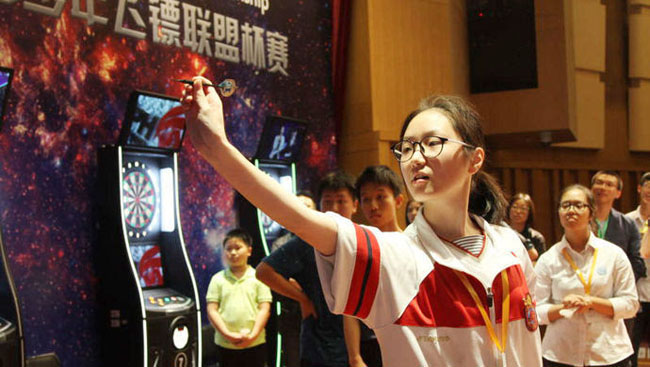 訓(xùn)練場(chǎng)上,57中一名女生右腿略彎支撐身體,橫向站立,側(cè)身、瞄準(zhǔn)、擲鏢,投中,順暢地完成了這一系列動(dòng)作。接著第二次,第三次…… 在這間教室內(nèi),7,8臺(tái)電子飛鏢機(jī),每個(gè)鏢靶都已經(jīng)插滿了針眼,可想訓(xùn)練之艱苦。這門選修一直吸引了很多學(xué)生參加,但是只有基礎(chǔ)的學(xué)生,練習(xí)成績(jī)過(guò)關(guān)的學(xué)生,才能成為學(xué)校運(yùn)動(dòng)隊(duì)一員,代表學(xué)校參加比賽。或許不久將來(lái),在國(guó)內(nèi)外飛鏢比賽賽場(chǎng)上,會(huì)更多一些天賦爆棚的新生代選手。