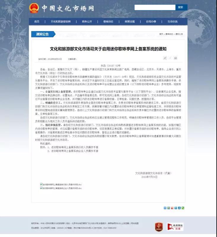 與此同時(shí),也出現(xiàn)了設(shè)備安全難保障、衛(wèi)生環(huán)境較差、歌曲內(nèi)容違規(guī)或者侵權(quán)等問(wèn)題,針對(duì)這些問(wèn)題,2017年,文化和旅游部發(fā)布了《文化部關(guān)于引導(dǎo)迷你歌詠亭市場(chǎng)健康發(fā)展的通知》,全面規(guī)范了迷你歌詠亭市場(chǎng),近日,文化和旅游部文化市場(chǎng)司印發(fā)了《關(guān)于啟用迷你歌詠亭網(wǎng)上備案系統(tǒng)的通知》,通知要求各相關(guān)部門(mén)全面實(shí)行網(wǎng)上備案管理,并明確了權(quán)責(zé)分工,規(guī)范了迷你歌詠亭的日常管理和監(jiān)督檢查工作。此消息一出,一石激起千層浪。