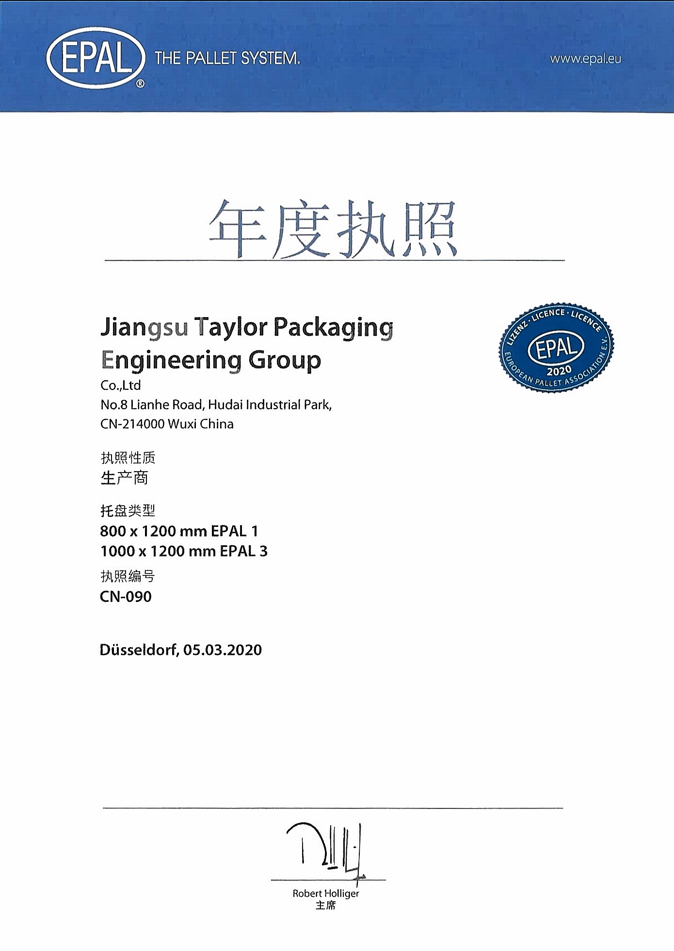 2020年03月05日江蘇泰來包裝工程集團有限公司成功取得EPAL年度執照,成為EAPL年度執照商
