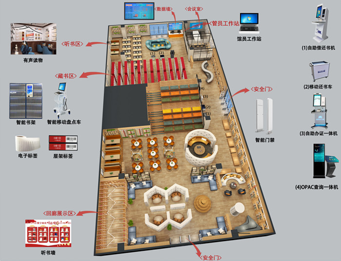 智能化圖書管理系統(tǒng)由:自助辦證機(jī)、自助借還機(jī)、RFID安全門、自助殺菌機(jī)、館員工作站、OPAC查詢系統(tǒng)、智能盤點(diǎn)推車等,完全實(shí)現(xiàn)圖書館自助化管理。